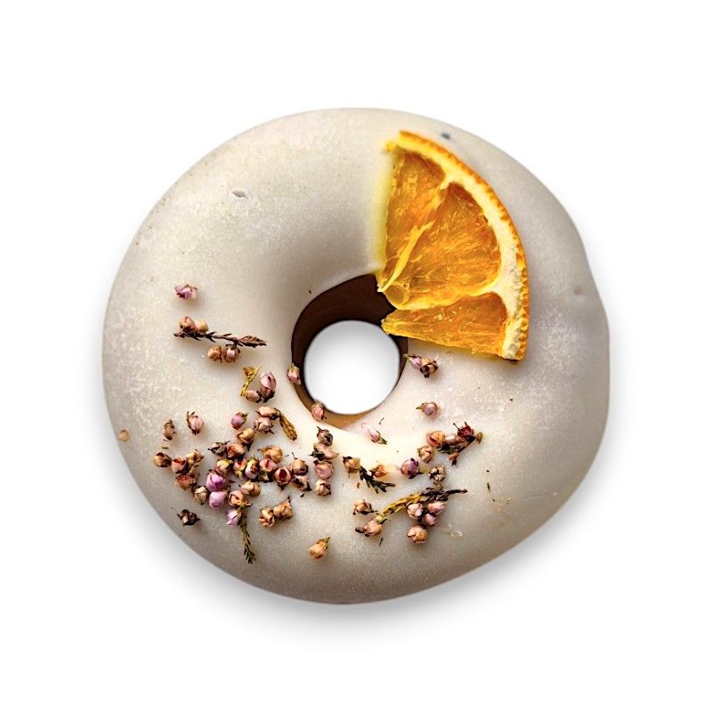 Speciální edice mýdla s čokoládovo-medovou vůní a bílým topem zdobeným kvítky vřesu a plátkem sušeného pomeranče. Ideální dárek nebo stylový doplněk do koupelny.
