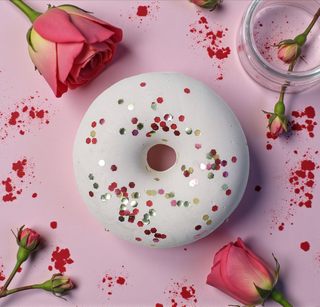Bílý základ zdobený růžovo-červenými třpytkami vytváří hravý, radostný a valentýnský dojem. Díky netradičnímu kruhovému tvaru se mýdlo skvěle hodí jako drobný dárek pro někoho, na kom nám záleží.